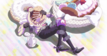Trong anime, anh ta mặc một chiếc áo choàng màu đen khi tới Whole Cake Chateau.