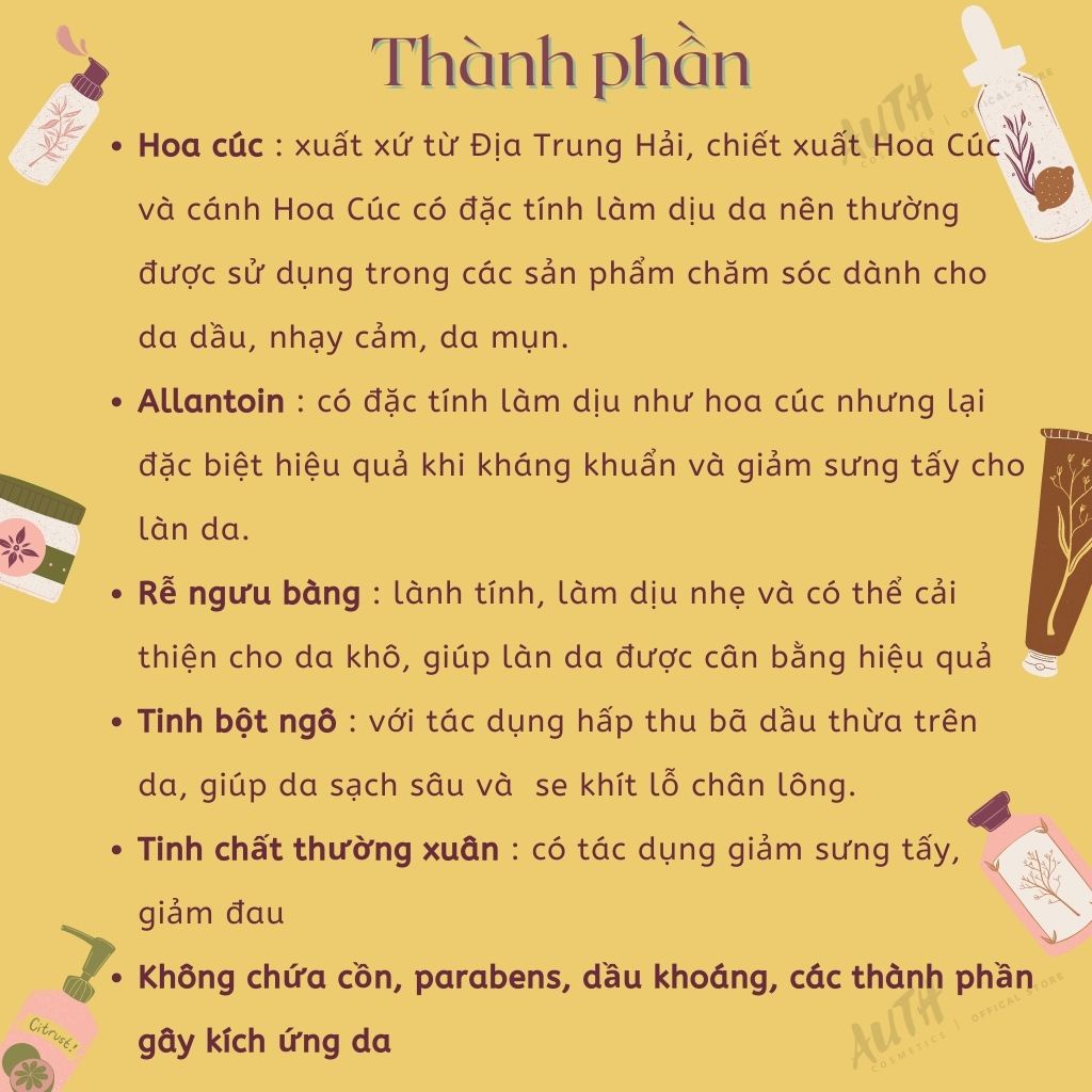 Toner hoa cúc Kiehl's Là loại sản phẩm chiết xuất từ cúc kim chẩn thảo (Calendula), Toner Kiehl.s hoa cúc Calendula Herbal Extract Alcohol-freecực kì dịu nhẹ dành riêng cho da thiên mụn hoặc da dầu. - Các thành phần chính của Toner hoa cúc Calendula Herbal Extract Alcohol-không lấy phí: + Chiết xuất tinh dầu từ hoa cúc vạn thọ. Tính chất nhẹ nhàng của nó lý tưởng cho tất cả nhiều chủng loại da. Nó làm mềm da và đặc biệt thích hợp cho da nhạy cảm. + Tinh chất hoa Burdock được nghe biết như thể hoạt chất kiềm dầu cho da nhờn trong suốt nhiều thế kỷ qua. Nó còn được nghe biết với đặc tính điều tiết sản xuất bã nhờn. + Allantoin là một hợp chất tìm thấy trong hoa Comfrey – một loại thảo dược được sử dụng trong y học thảo dược. Được nghe biết là một chất ức chế vi khuẩn, Allantoin hoàn toàn có thể làm dịu và giảm viêm. - Chai nước cân đối này còn có mùi hương nhẹ nhàng, thoang thoảng, khi thoa lên da không khiến cảm hứng khô căng hay nhờn rít, những vết mụn đang sưng đỏ cũng tiếp tục dịu hơn. Giống như nhiều chủng loại nước hoa hồng khác, bạn chỉ việc dùng bông tẩy trang, áp toner lên mặt rồi vỗ nhẹ, da sẽ có cảm hứng được ngậm nước và tươi tắn ngay lập tức. https://www.facebook.com/LeafCosmetic Xuất xứ: Mỹ Dung tích: 40ml Thương hiệu: Kiehl's Hạn sử dụng: 3 năm Tính từ lúc ngày sản xuất Số lô: in trên bao bì Công ty phụ trách: Sephora USA, LLC Corporate Địa chỉ: 525 Market Street 32nd Floor San Francisco, CA 94105-2708 USA