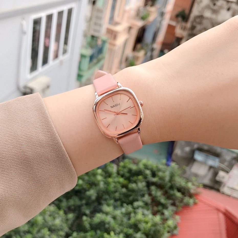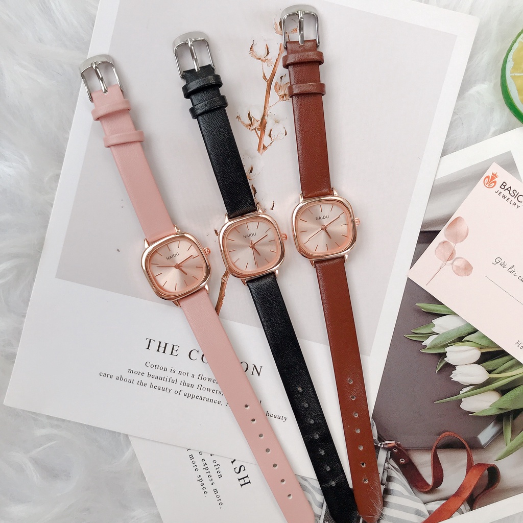 Đồng hồ nữ NAIDU mặt vuông phong cách Nước Hàn viền sắt kẽm kim loại dây da Basic Jewelry phối màu trẻ trung