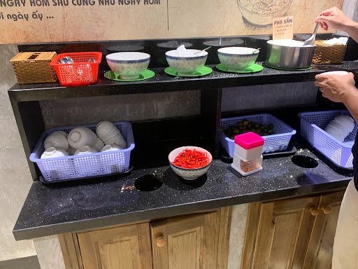 Ban đầu vì mình ăn nhạt , nhận tô mình có nếm qua nước dùng thấy ngọt thanh vừa miệng nên mình cho chút xíu thìa gia vị quậy nhưng ăn cứ thấy sai sai :)) ăn đc nửa tô mình cho thêm hẳn 1 thìa đó thì thấy nước dùng khá ngon . Do đó bạn nào tới ăn cứ mạnh dạn cho thêm gia vị rồi hãy ăn nhé :))