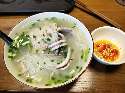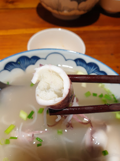 Quán khá đông khách (nhất là buổi sáng). Mình order 2 tô truyền thống gồm chả cá và mực ăn thử. Cách bạn hàng ở đây khá giống với những tiệm trà sữa, cafe highland. Thanh toán - nhận máy rung - ra lấy đồ ăn. Riêng nước chấm cũng khá được bố trí theo hướng dẫn và phải tự làm.