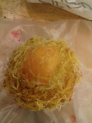 Giải cứu thanh long . Biệt đội giải cứu quá hùng hậu mà số lượng bánh lại hạn chế. Hổm rài thấy hot quá mà nay mới sắm được. Chạy ngang chi nhánh q5 mà thấy xếp hàng dài khiếp quá nên quay về chi nhánh B.Thạnh thì hên quá ngay lúc tiệm vừa ra mẻ bánh mới nóng hổi giòn rụm luôn mà khách cũng không đông nữa vừa mới gắp được 2 ổ lên khay thì thấy người người kéo vào càn quét sạch sẽ những ổ còn sót lại trong chớp nhoáng Bánh mì thanh long này ăn vị cũng tương tự như bánh mì thường thôi chứ không còn vị thanh long trộn lẫn rõ rệt, được cái red color của thanh long nhìn rất đẹp mắt, loại đặc ruột, ăn không thì hơi nhạt nhẽo nên chấm với sữa đặc là combo ngon miễn chê luôn . . Sẵn dịp mình mua thêm bánh bông lan trứng muối ăn rất ngon luôn trứng muối hoàn toàn có thể làm mình thèm ở mức độ cao là đây
