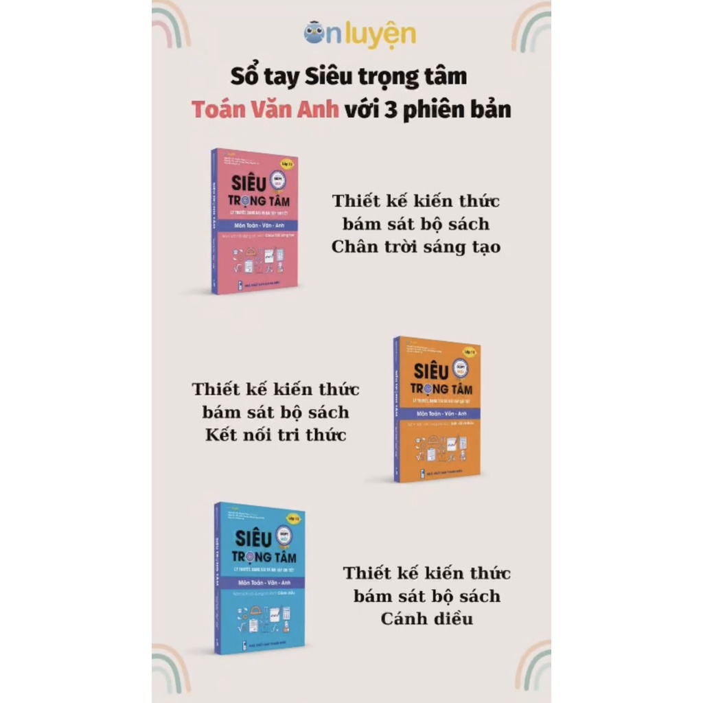 Từ năm nay, học viên lớp 10 (rõ ràng là 2k7) sẽ học theo chương trình GDPT mới, theo đó có 3 cuốn sách: Kết nối tri thức, Chân trời sáng tạo và Cánh diều sẽ được chính thức giảng dạy trong trường học. Nhà sách Ôn luyện tiên phong là ĐƠN VỊ ĐẦU TIÊN biên soạn cuốn sách SIÊU TRỌNG TÂM lớp 10 bám sát theo nội dung chương trình mới của tất cả 3 cuốn sách. Sách Siêu trọng tâm môn Toán Văn Anh được viết riêng cho bộ Kết nối tri thức gồm 2 cuốn, phù hợp cho tất cả bạn theo khối hoặc ko theo khối - Cuốn 1: Toán - Văn - Anh - Cuốn 2: Lí - Hóa - Sinh Sách gồm 4 nội dung: - Tổng hợp kiến thức và kỹ năng trọng tâm nhất của 3 môn theo sách Kết nối tri thức - Phân tích từng bước giải mọi dạng bài từ dễ tới khó kèm kí dụ minh họa, giúp học viên thuận tiện và đơn giản tiếp cận kiến thức và kỹ năng mới - Bài tập full đáp án và giải rõ ràng - Bộ đề thi thời điểm giữa kỳ, thời điểm cuối kỳ theo phân bổ cấu trúc của Bộ giáo dục tin tức rõ ràng cuốn SIÊU TRỌNG TÂM môn Toán - Văn - Anh NXB Thanh Niên Tác giả: Nguyễn Thị Huyền Nga, Nguyễn Linh Trang, Đặng Thị Nguyệt Hà, Nguyễn Khánh Ly Năm xuất bản: 2022 Nhà Phát Hành: Cty CP học viện chuyên nghành đào tạo trực tuyến VN tin tức rõ ràng cuốn SIÊU TRỌNG TÂM môn Lí - Hóa - Sinh NXB Thanh Niên Tác giả: Trương Hương Nhi, Đỗ Khắc Hùng, Đào Thị Hường, Lương Thị Den, Lê Thị Minh Phương Năm xuất bản: 2022 Nhà Phát Hành: Cty CP học viện chuyên nghành đào tạo trực tuyến VN