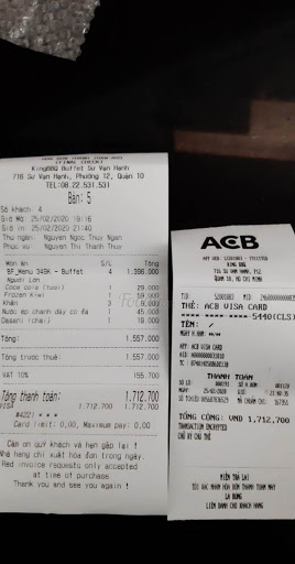 quán nên xem lại cách phục vụ. Mang tiếng đi ăn bufet mà đưa được ra 2 lần đồ ăn xong im luôn. Gọi mấy lần mới đưa thêm. Bếp thì được lúc đầu xong nguội ngắt. Ăn mất hứng. Nhân viên thì chậm rãi, không nhiệt tình. Nơi không đáng để đến. Phục vụ tốt tính bo thêm tiền mà thấy bực mình không bo đồng nào luôn. Mở bufet ra mà ăn chả phê tí nào