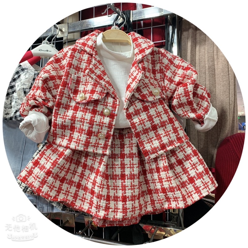 Sét váy bé gái dạ kẻ và áo len đỏ
