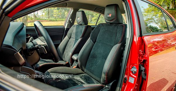 Ghế xe Vios GR-S 2023 có tông màu đen với ghế được bọc da pha nỉ với đường chỉ khâu red color mẫu mã thể thao với logo GR-S để thể hiện sự khác lạ